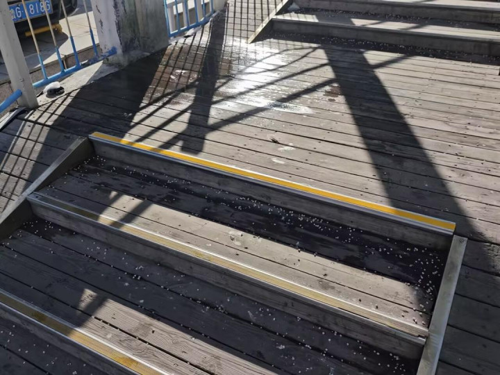 记者在现场看到,新安装的防滑条材质与木质台阶贴合紧密,整体结构平整稳固。